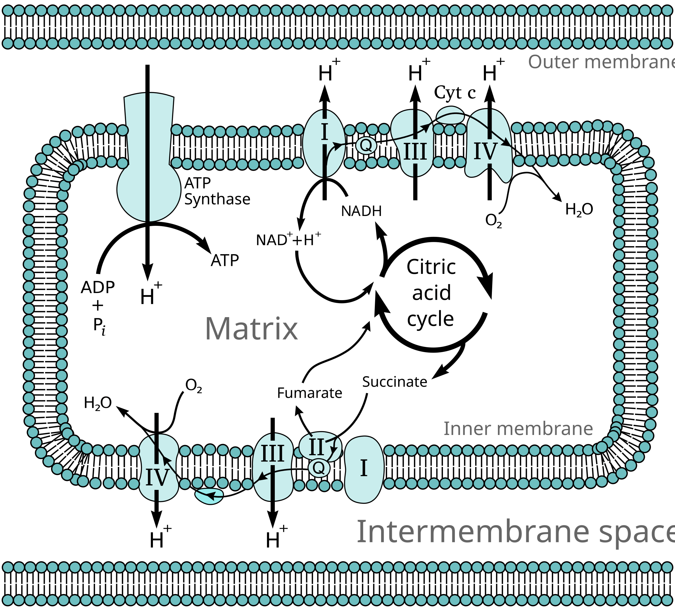 In short, the electron transport chain involves the flow of electrons through a respiratory chain. Electrons pass through three protein complexes that are embedded in the inner mitochondrial membrane: NADH-Q oxidoreductase (Complex I); Q-cytochrome c oxidoreductase (Complex III); and cytochrome c oxidase (Complex IV). Complex I, a large multi-subunit protein, is the enzyme that catalyzes the transfer of electrons from the reducing agent (electron donor) NADH to coenzyme Q. The electrons are relayed to cytochrome c at Complex III, and Complex IV transfers the electrons to oxygen, which is thus reduced to water. Complexes I, III, and IV serve as proton pumps, using the energy from electron transfer to transport protons from the matrix into the intermembrane space. The complexes utilize the energy given up by the flow of electrons. The inner mitochondrial membrane is impermeable to protons, leading to their accumulation in the intermembrane space.