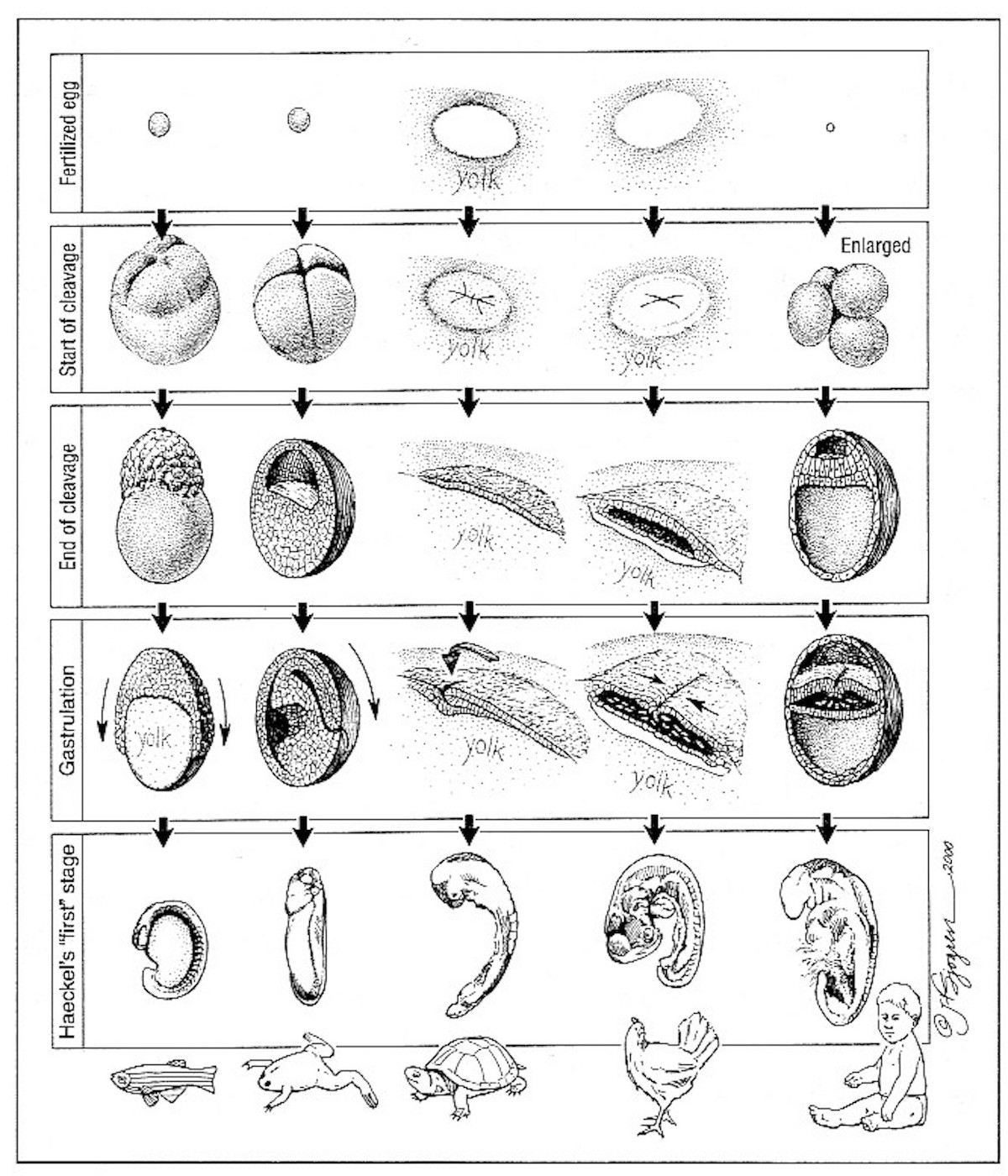 In 1868, German Darwinist Ernst Haeckel published a drawing of eight embryos: a fish, a salamander, a turtle, a chick, and four mammals (hog, calf, rabbit, and human). Each was shown in three stages of development. In the earliest stage (at the top), the embryos are strikingly similar.
