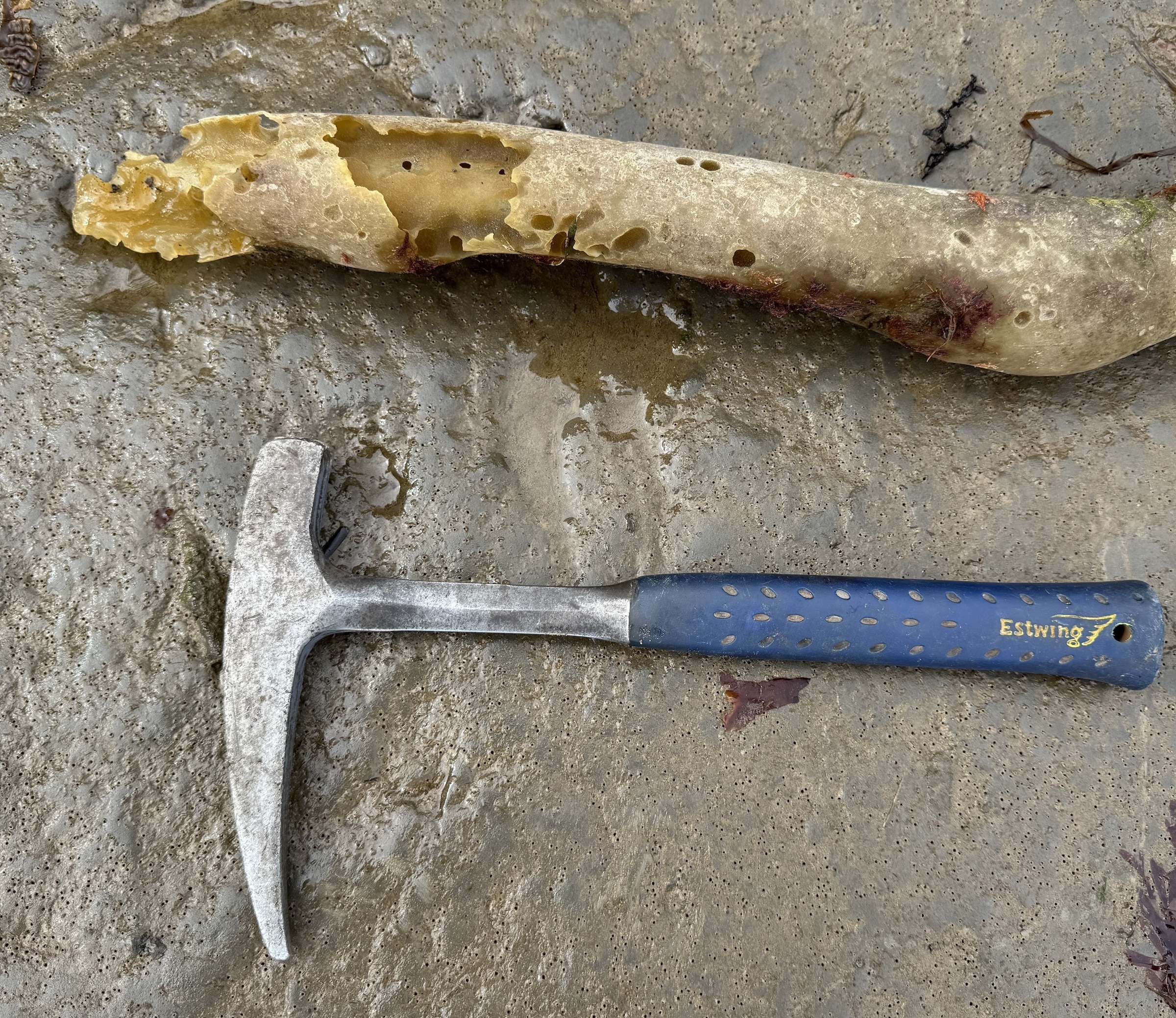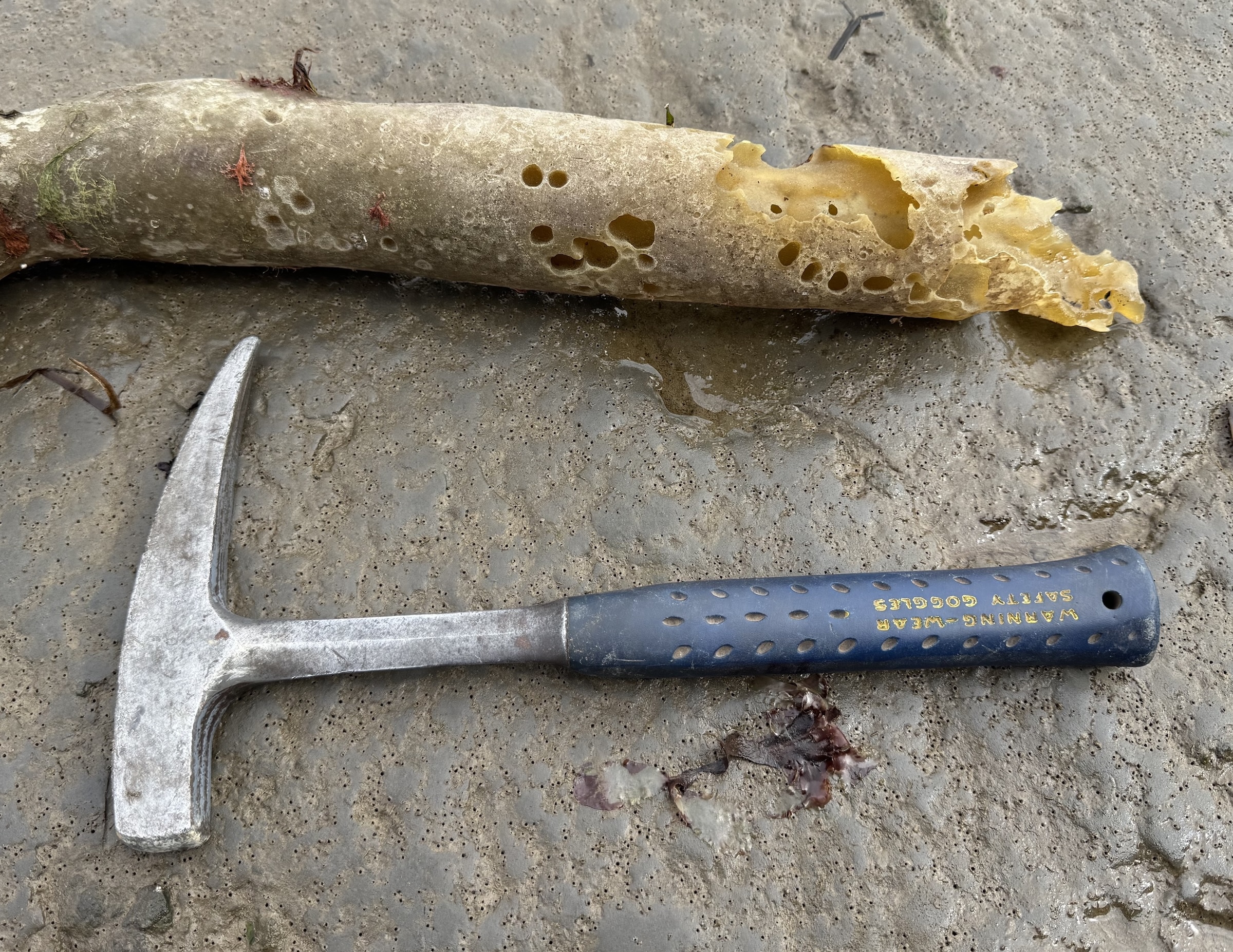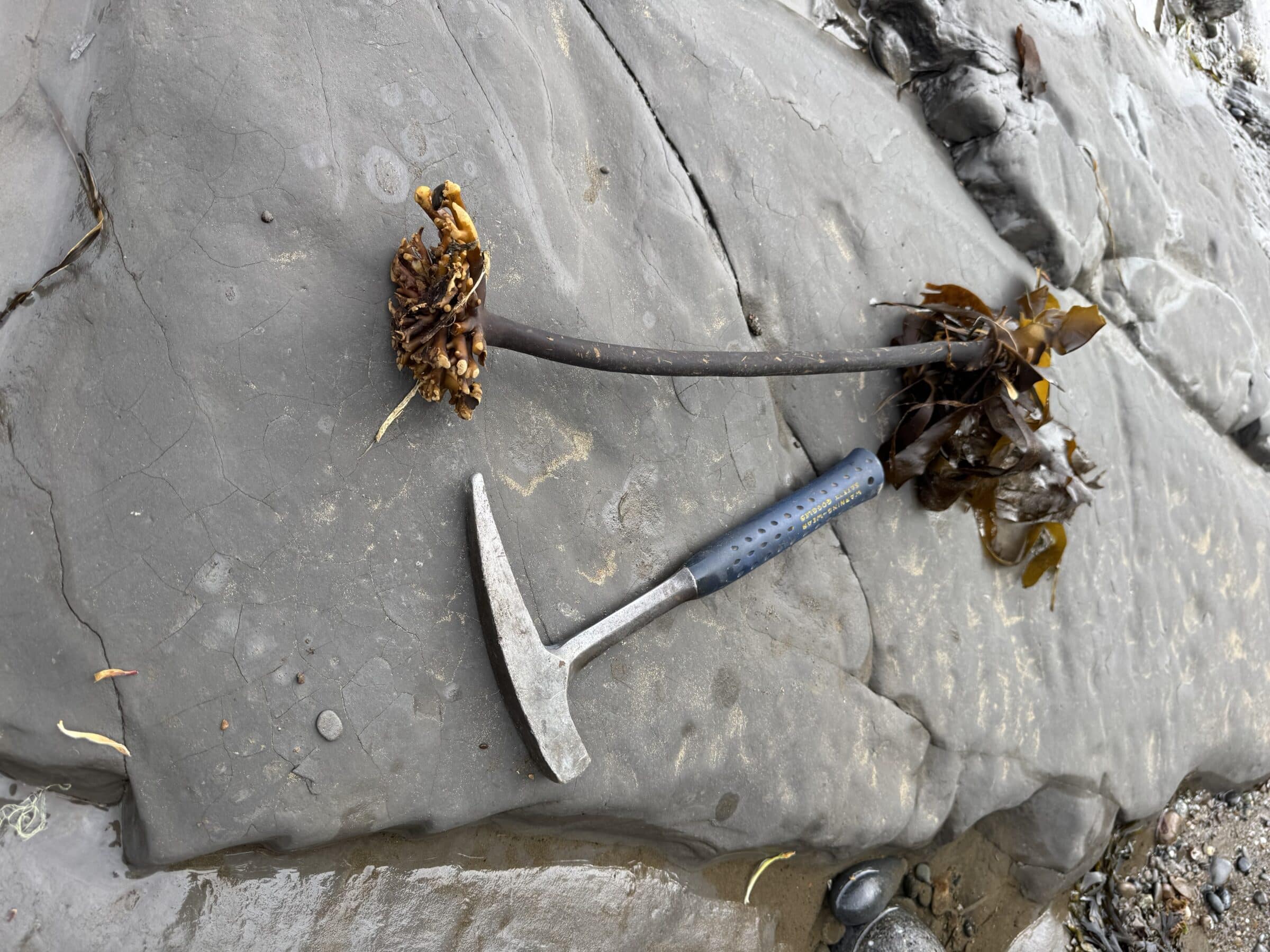During our excursion, I also stumbled on a few things that, with that Science paper in mind, caught my attention. In one instance I found a kelp on the beach with its holdfast still nicely attached. A photo of it is at the top (the holdfast is near the pointy “pick” end of my rock hammer). This is not an unusual find for the area, but it reminded me of the fossil in Figure 3 of the Science paper labeled “A to E” which had a “basal holdfast disc” — a fossil that the paper labeled as a “bilaterian” animal.